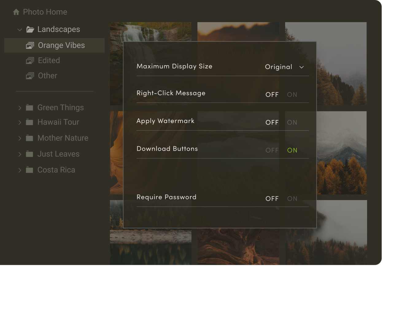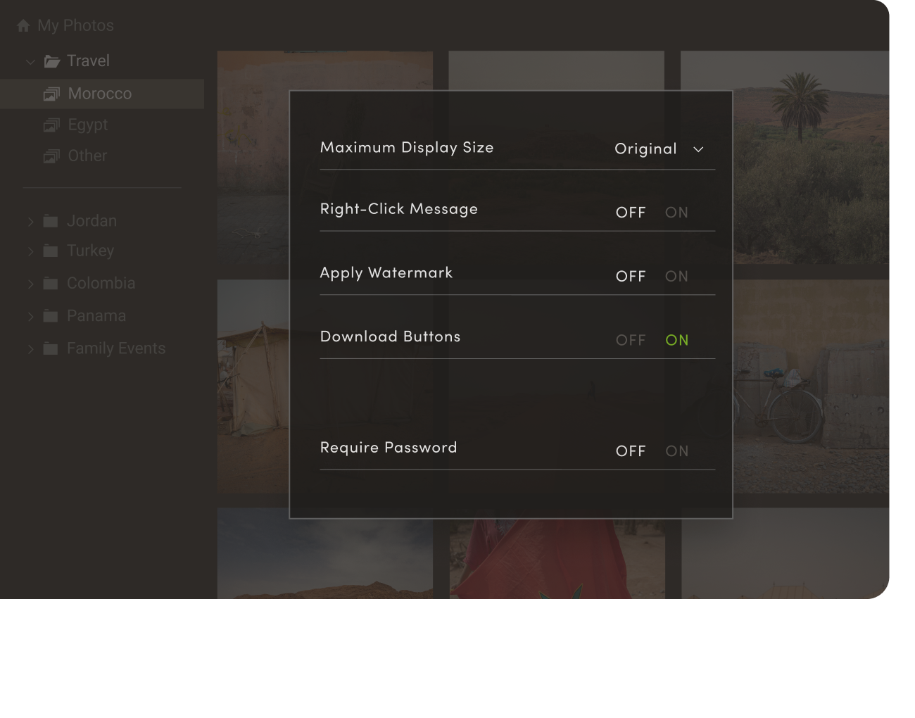 Our advanced security settings will protect your photos from theft and misuse with watermarks, privacy settings, right click protection, and display size limits to keep your photos safe.